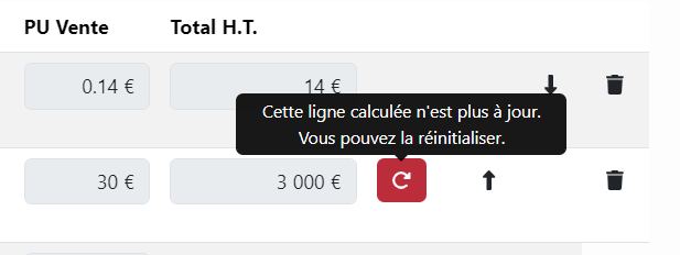 Les lignes générées automatiquement sont toujours modifiables manuellement. En cas de différence de quantité ou de prix par rapport à ce qui a été généré, un bouton permet de reprendre la valeur générée :